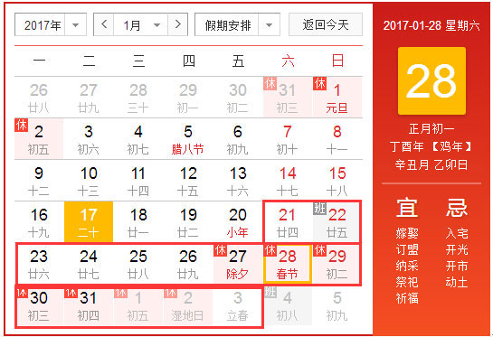 放假时间为2017年1月21日(农历腊月二十四)至2日3(正月初七)共14天(如上图,红框为休息时间),2月4日(正月初八)正式上班,腊月二十四为公司年假时间;